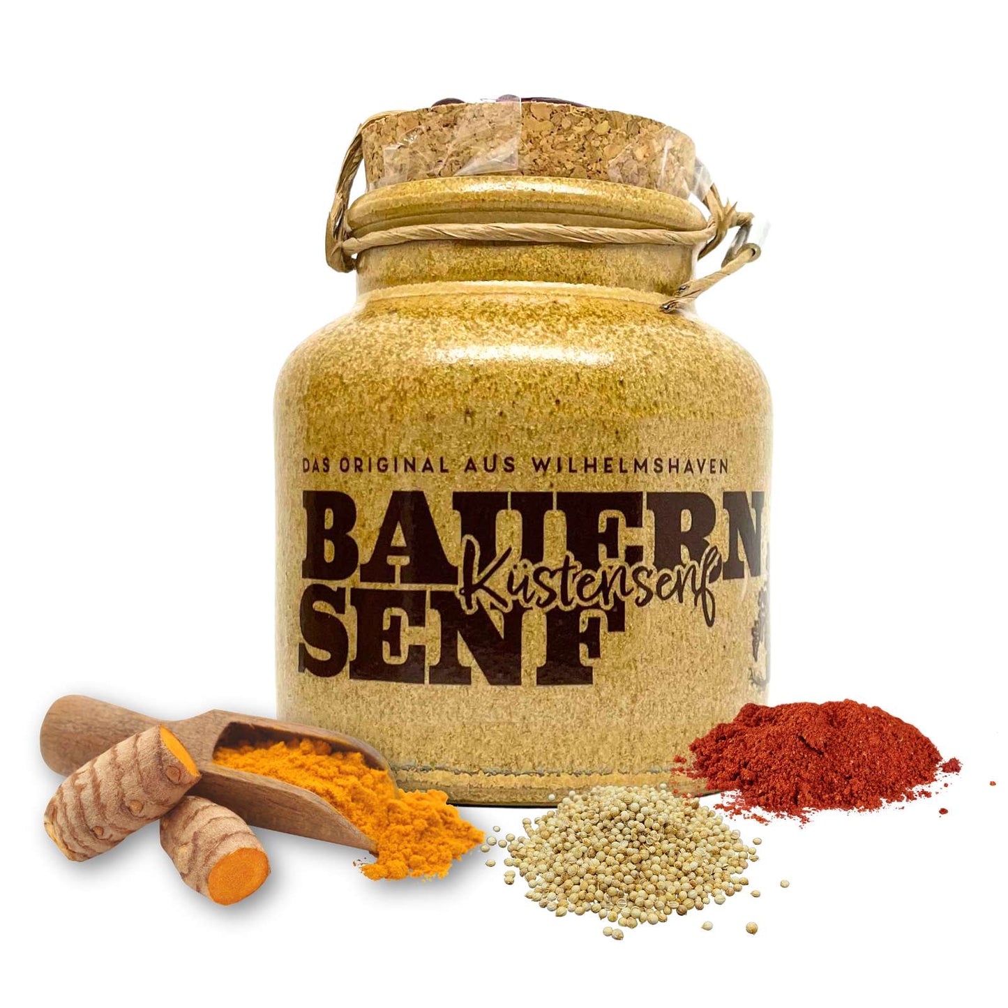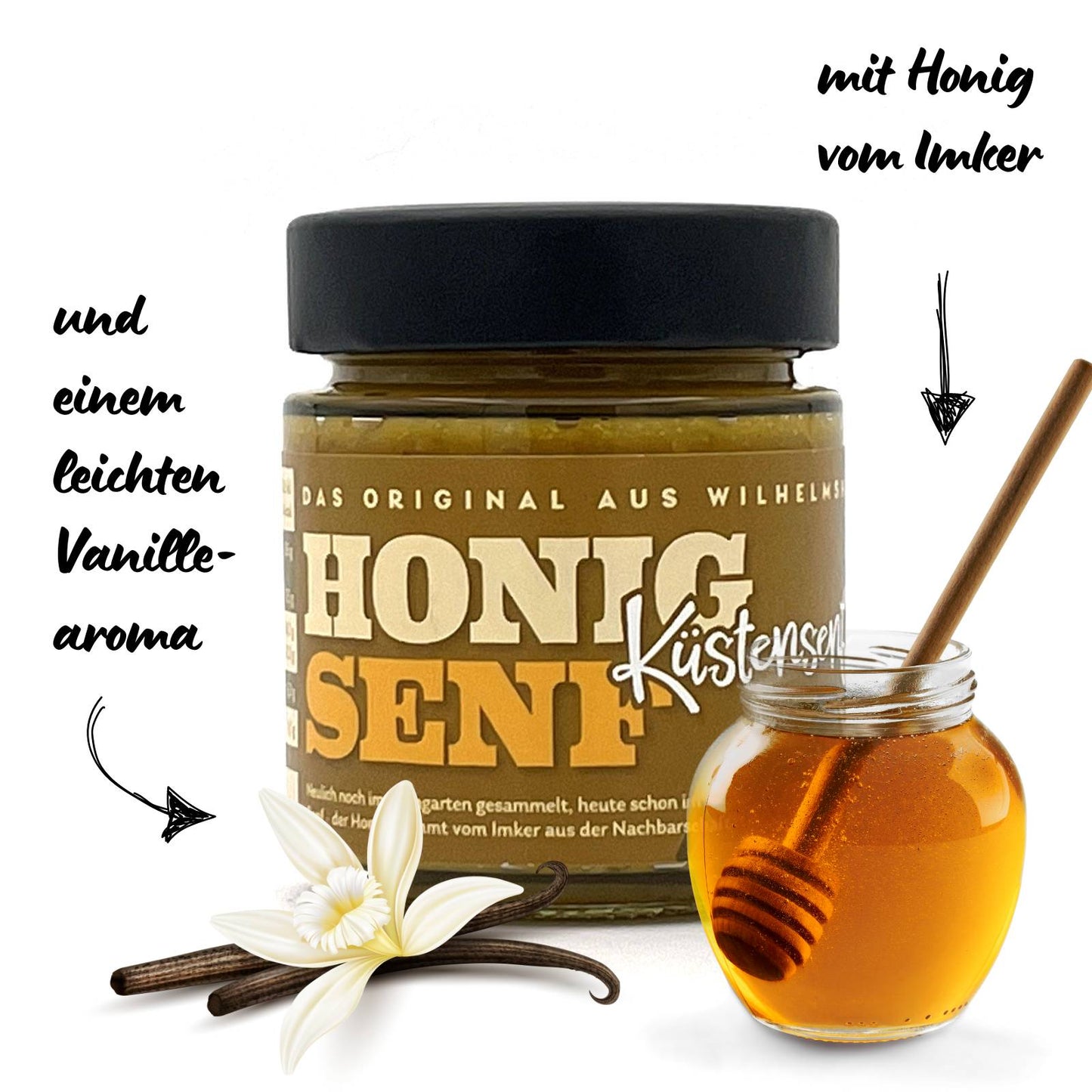 Wir machen besonderen Senf. Aber nicht nur süßen Senf, milden Senf, mittelscharfen Senf oder scharfen Senf, sondern in ausgefallenen Geschmacksrichtungen, die man bei großen Senfherstellern kaum findet. Über 20 verschiedene Sorten vertreiben wir bereits unter unserer Marke „Küstensenf“ und es werden ständig mehr. In unserem Sortiment uns hat schon jeder „seinen Senf“ gefunden – süß mit Honig, scharf mit Habanero-Chili, fruchtig mit Feige oder Orangen, kräftig würzig mit Rum und schwarzen Pfeffer, friesisch würzig mit Kapern und Sardellen, pikant mit süßer Chili oder einfach nur mittelscharf, mit Kräutern und Gewürzen oder zuckerfrei. Unser scharfer Senf übertrifft mit seinem scharfem Geschmack. Unsere verschiedenen Senfe und viele weitere Spezialitäten kann man online in unserem Webshop kaufen. Wer aber nicht den Senf online kaufen sondern mal verkosten möchte, kann uns auch gerne in unserem Ladengeschäft Senfonie in der Südstadt von Wilhelmshaven besuchen. Hier gibt es neben köstlichem Senf auch Liköre, ausgesuchte Fruchtaufstriche, Dips, Dressings, regionalen Honig, Gewürze und Gewürzmischungen nach eigener Rezeptur.