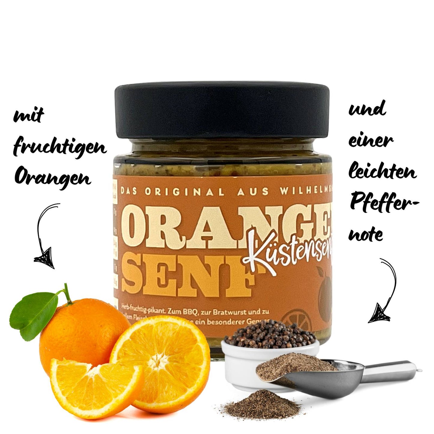 Entdecke unseren handgemachten Orangensenf mit fruchtigen Noten von Orangen und Mandarinen, verfeinert mit einem Hauch grünen Pfeffer. Perfekt für Fleisch und Gemüse!