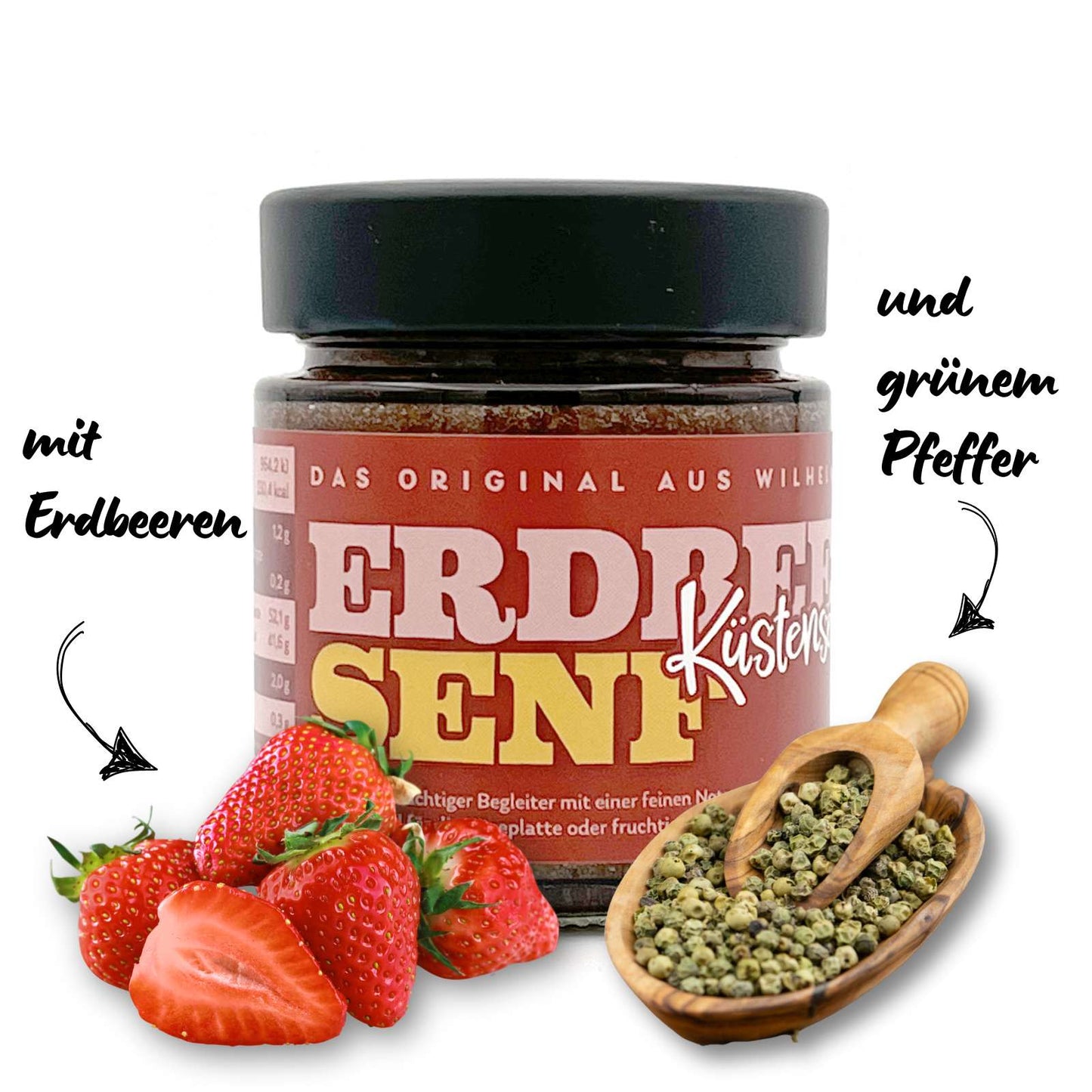 Entdecke unseren Erdbeersenf: Eine harmonische Mischung aus süßen Erdbeeren und einem Hauch grünem Pfeffer, perfekt für Dressings oder zum Käse