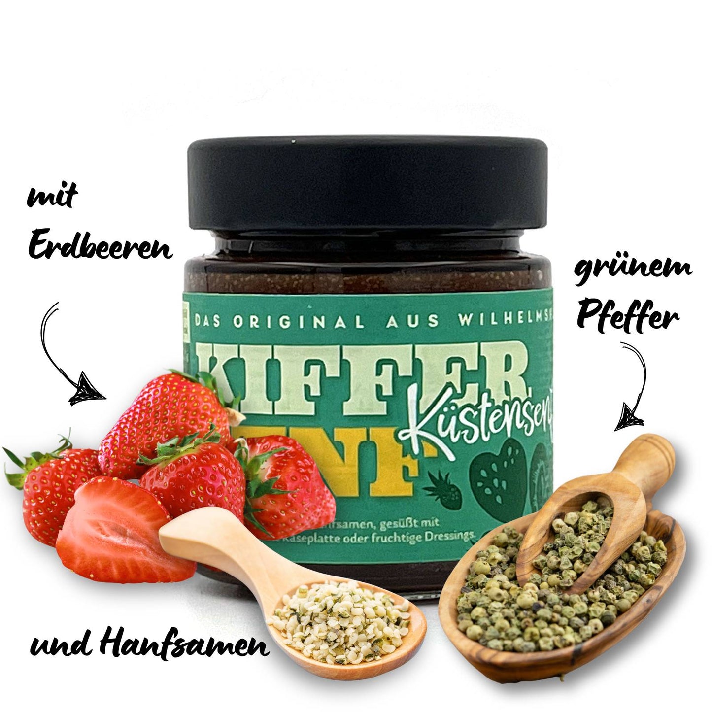 Entdecke unseren handgemachten Kiffersenf mit fruchtigen Erdbeeren und knackigen Hanfsamen. Perfekt für Fleisch, Gemüse und fruchtige Dressings