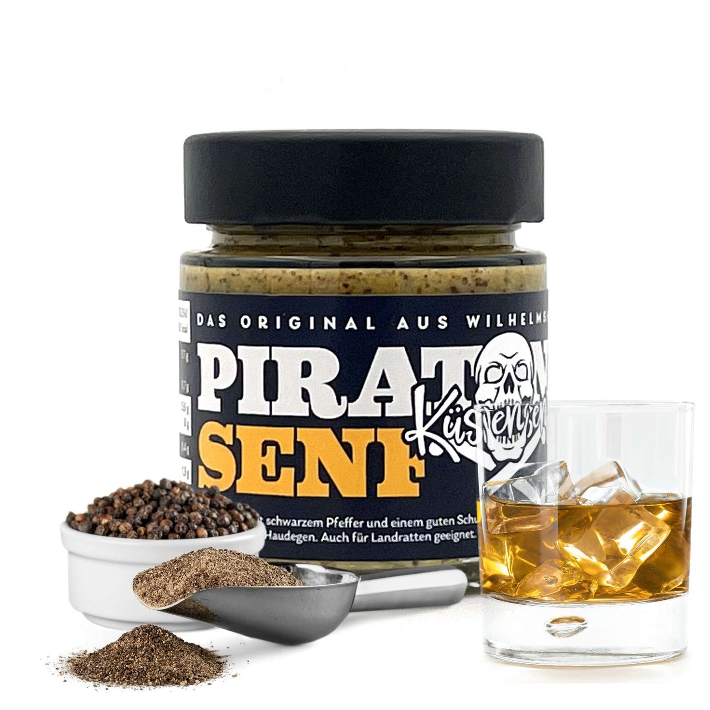 Entdecke den kräftigen Geschmack von Piratensenf mit schwarzem Pfeffer, ganzen Körnern und einem Schuss Rum – perfekt für Steakliebhaber.